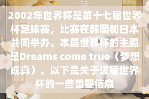 摘要:2002年世界杯足球赛是第十七届比赛,在韩国和日本共同举办,主题为Dreams come true。该届世界杯见证了众多精彩比赛和难忘的瞬间,同时也留下了许多重要信息,成为世界杯历史上的一个重要篇章。