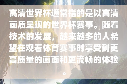 高清世界杯通常指的是以高清画质呈现的世界杯赛事。随着技术的发展,越来越多的人希望在观看体育赛事时享受到更高质量的画面和更流畅的体验。