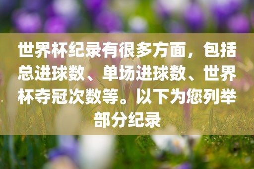世界杯纪录有很多方面,包括总进球数、单场进球数、世界杯夺冠次数等。以下为您列举部分纪录