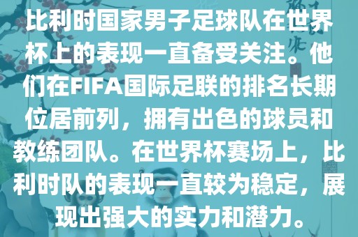 比利时国家男子足球队在世界杯上是一支备受关注的球队,他们拥有强大的实力和潜力,始终在比赛中展现出出色的表现,他们仍将是世界杯赛场上的重要竞争者之一。