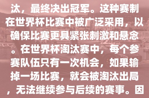 世界杯淘汰赛是一种紧张刺激的足球赛事赛制,要求参赛队伍具备出色的实力和战术安排,通过单败淘汰的方式,最终决出冠军,为球迷们带来精彩的足球盛宴。