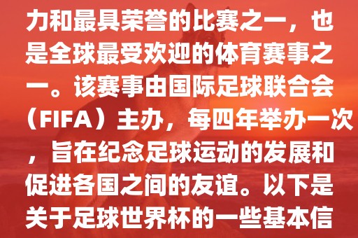 足球世界杯是足球界最具影响力和最具荣誉的比赛之一,也是全球最受欢迎的体育赛事之一。该赛事由国际足球联合会(FIFA)主办,每四年举办一次,旨在纪念足球运动的发展和促进各国之间的友谊。以下是关于足球世界杯的一些基本信息
